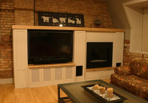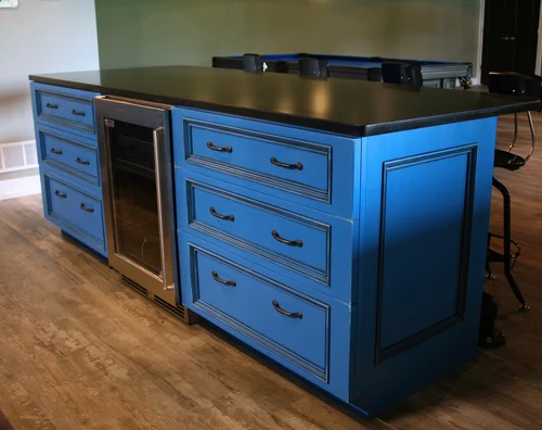 A pop of color makes this entertainment space a focal point of the home. Chicken wire glass and a custom distressed finish bring a rustic charm to the otherwise modern space.