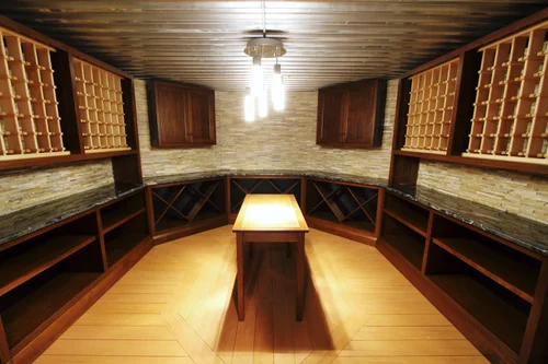 Sophisticated and warm, this multi-purpose lower level is an entertainer's dream. Complete with a custom cork table, a private wine room gives guests an intimate place to gather.