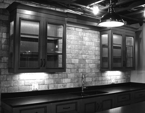 Cabinetry, distressed island, appliance paneling, open shelving, crown molding